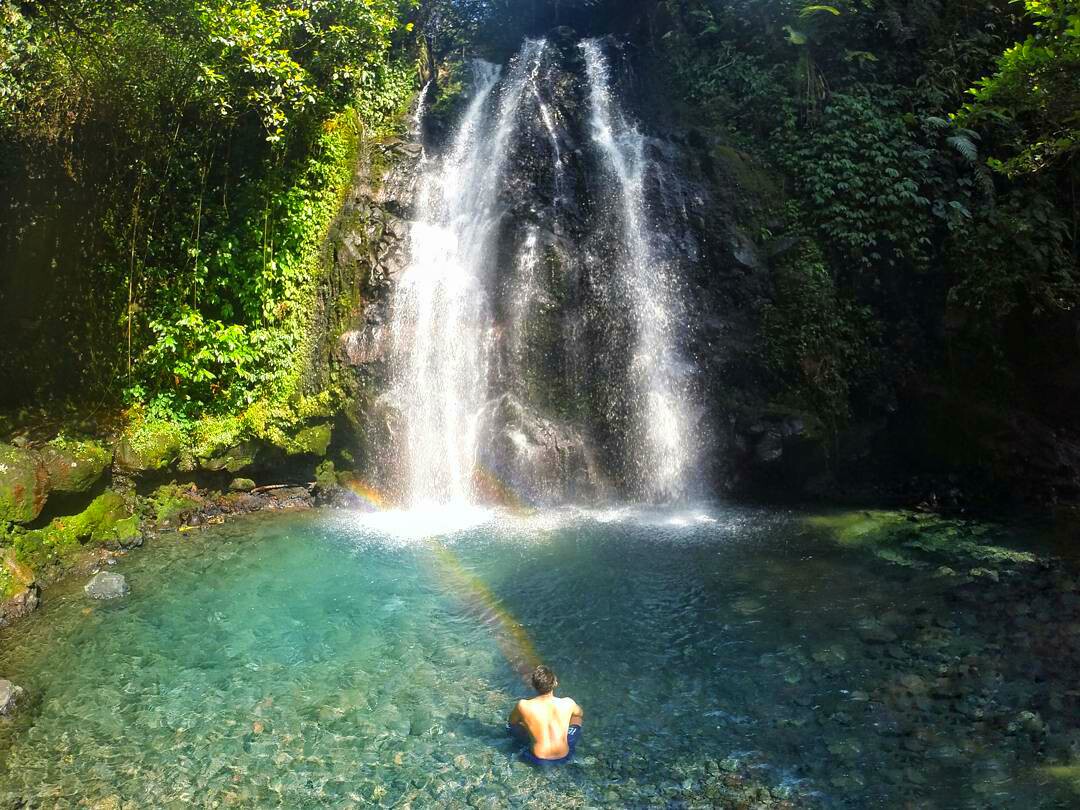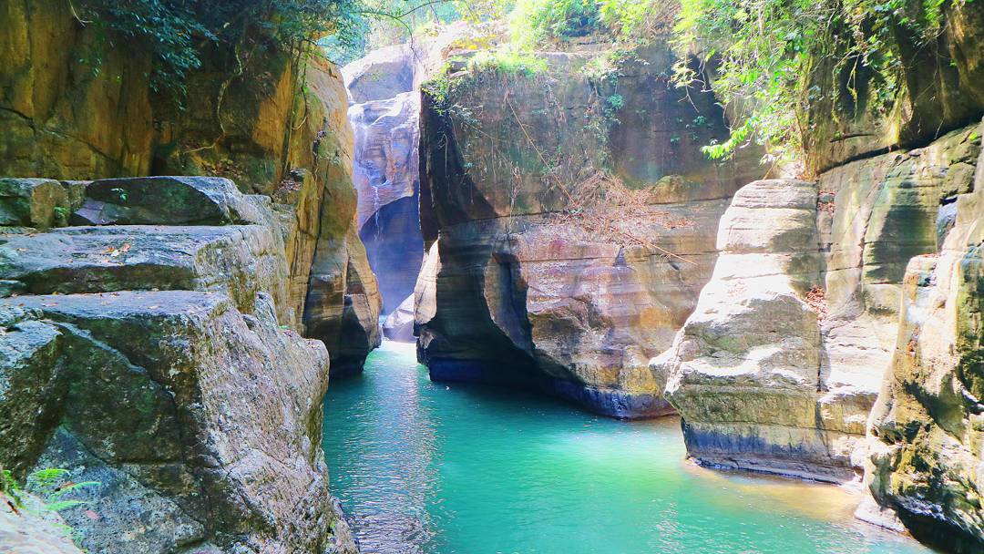 Air terjun ini tidak memiliki aliran yang begitu deras. Namun airnya jatuh ke kolam di bawahnya. Airnya yang berwarna hijau kebiruan berpadu dengan tebing batu dan pepohonan hutan yang rimbun. Kolam ini jadi makin instagenik.