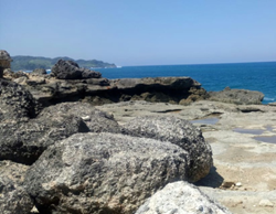 Pinggiran pantai ini adalah batuan karang serta genangan air. Tapi memiliki pemandangan yang sungguh indah.