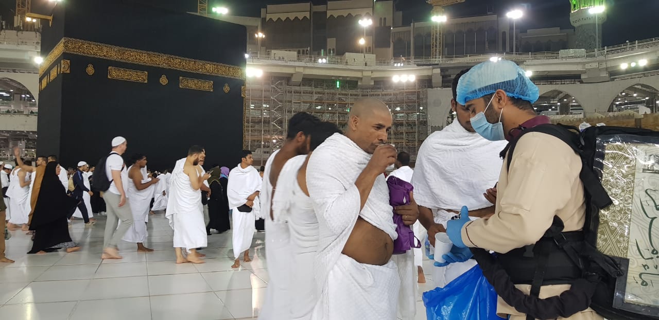 Jamaah umroh sedang minum air zam zam yang disediakan petugas